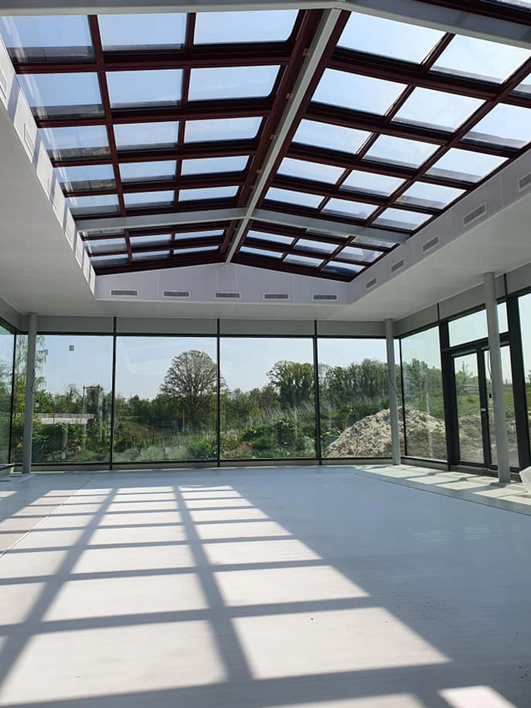 Het schuifdaksysteem is opgebouwd uit een serie aluminium profielen met daartussen vensters die bestaan uit een vast raam en twee schuivende ramen. Schuifdaken kunnen dus voor 2/3 van het gehele oppervlakte geopend worden. De vensters kunnen naast elkaar geplaatst zodat een schuifdak gerealiseerd kan worden tot zeer grote oppervlakten. Dit maakt onze schuifdak systemen uitermate geschikt voor diverse oplossingen.